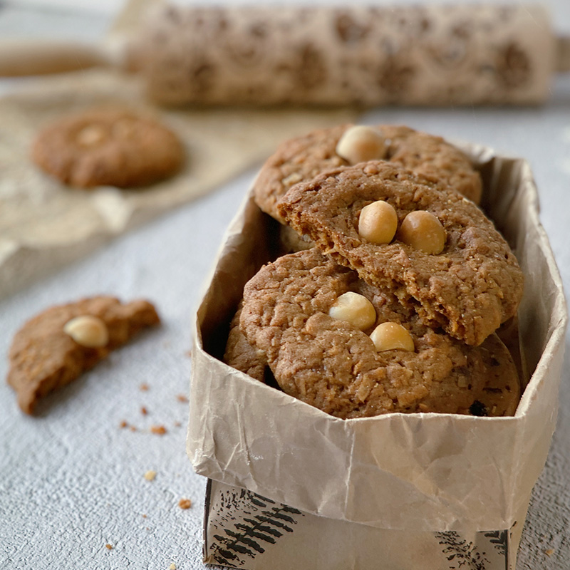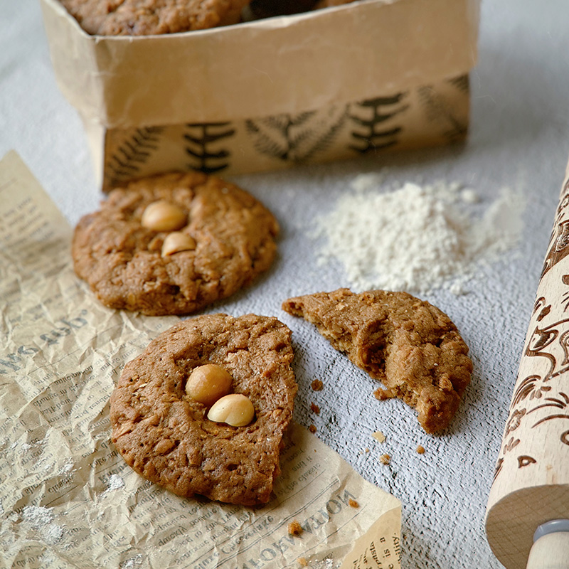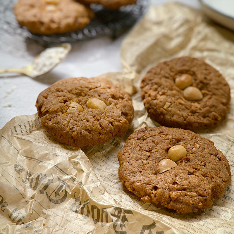 奶油、黑糖、小蘇打、麵粉、夏威夷豆、椰子絲、蛋、鹽、糖